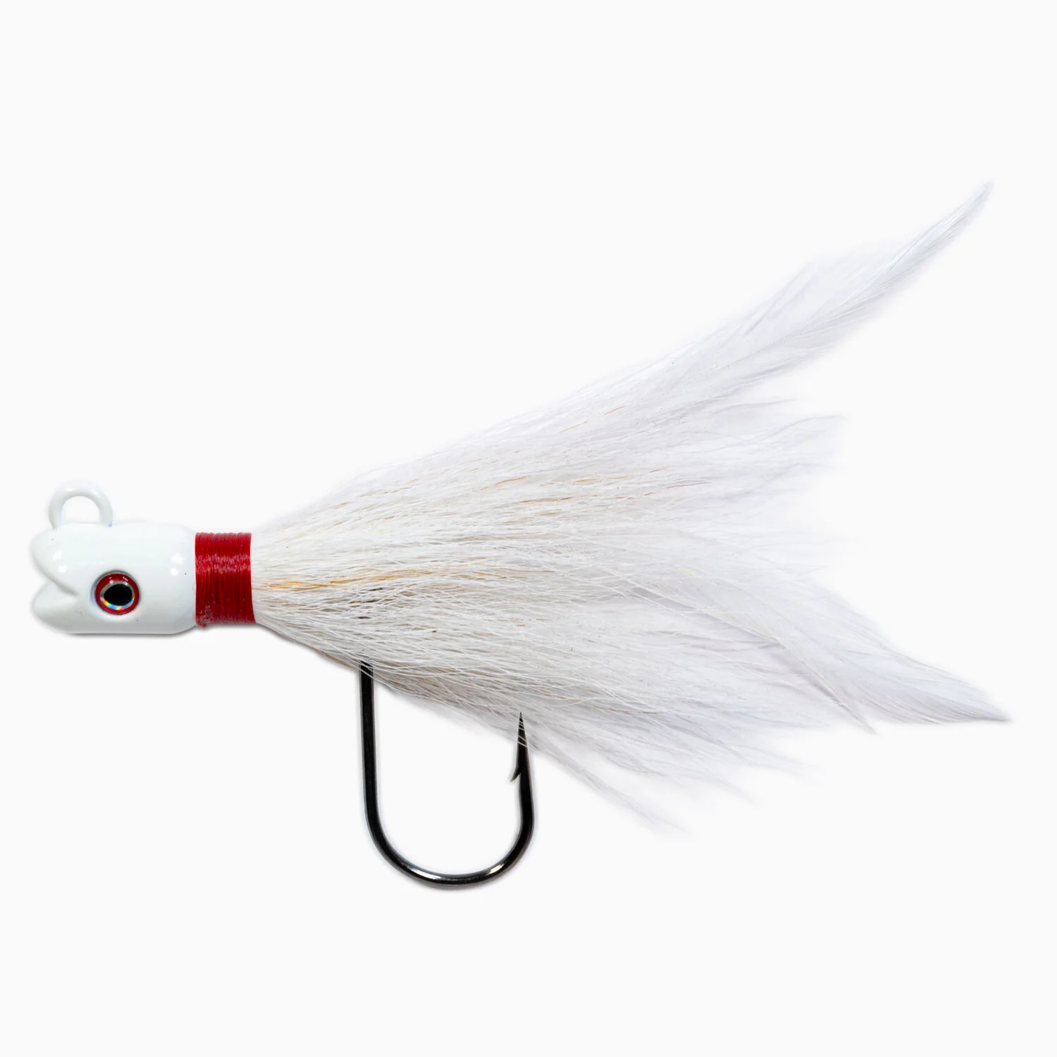 Dark Matter John Skinner Swing Hook Striped Bass Bucktails take a proven classic and elevate it with modern performance. Built on a streamlined bullet head and finished with lifelike 3D recessed eyes, these bucktails deliver a natural presence that triggers aggressive strikes. Every jig is tied with the perfect hair density—full, balanced, and consistent—so the profile holds true in current, surf, and tidal sweep.